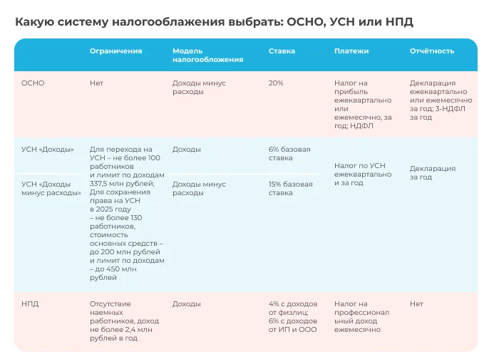| ОСНО | 20% НДС‚ налог на прибыль | Нет ограничений по доходу и численности сотрудников | Большие возможности для оптимизации налогообложения (при наличии квалифицированного бухгалтера) | Сложный учет‚ большая отчетность |